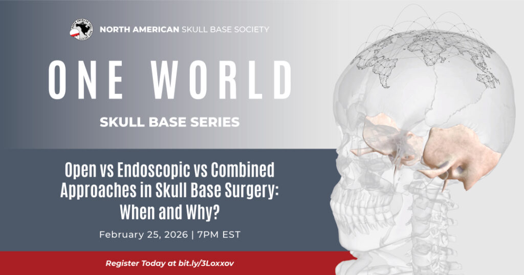 We’re excited to announce the second installment of the One World Skull Base webinar series through the NASBS discussing Open vs Endoscopic vs Combined Approaches in Skull Base Surgery: When and Why? Teams will be presenting from UCSF, University of Miami, University of Toronto, and Ottawa Hospital. Skull base transcends boundaries, languages, and cultures. This is an opportunity to see how the world tackles complex skull base cases. The One World Skull Base series includes teams from around the world covering different aspects of the field, such as surgical considerations and techniques, joint approaches, and management. These webinars are designed to provide educational resources for all practitioners in the field of skull base. We hope you can join!